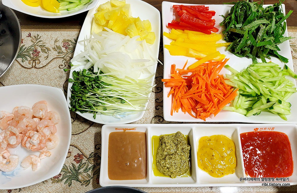 아들 녀석은 좋아하는 새우 위주로 채소를 가득 곁들여 먹는군요.