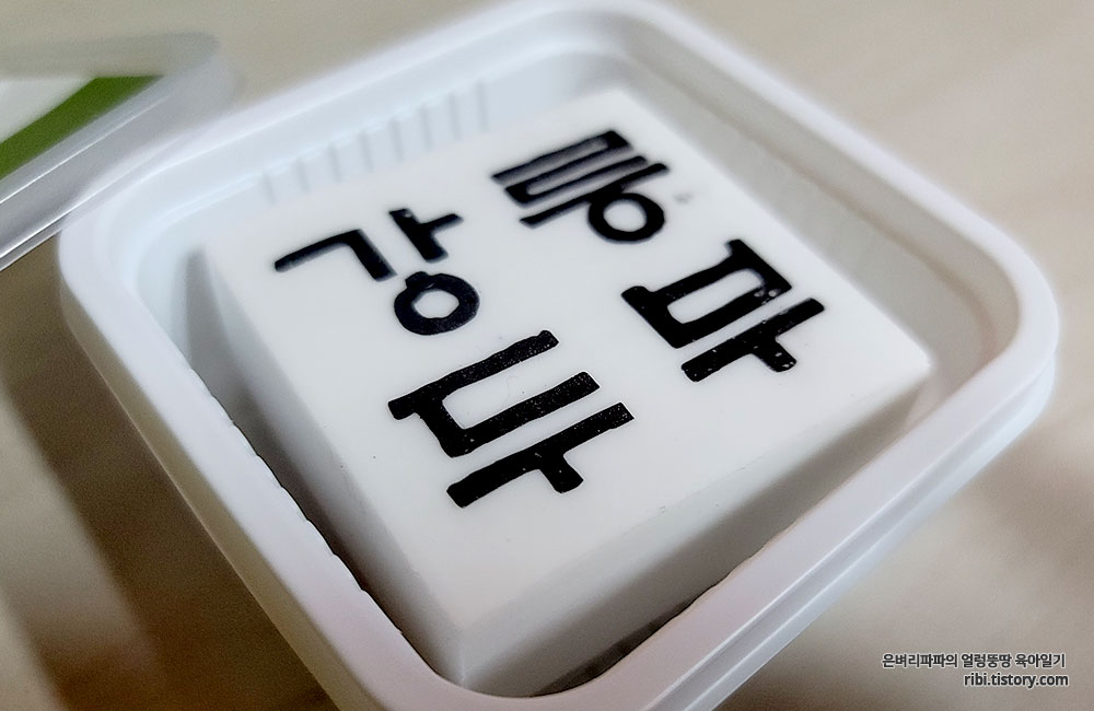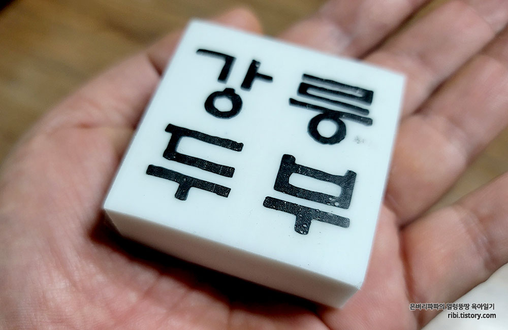 유산지를 걷어내니, 진한 글씨의 강릉 두부라는 글자가 눈에 더 띕니다.