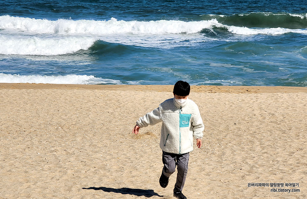 놀다 와도 되냐는 아들 녀석의 말에 엄마, 아빠는 몸을 움츠리고 모래사장에서 넓은 바다 멍을 즐겼습니다.