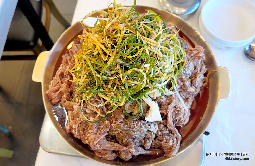 한우와 파가 산더미처럼 쌓여 나오는 불고기