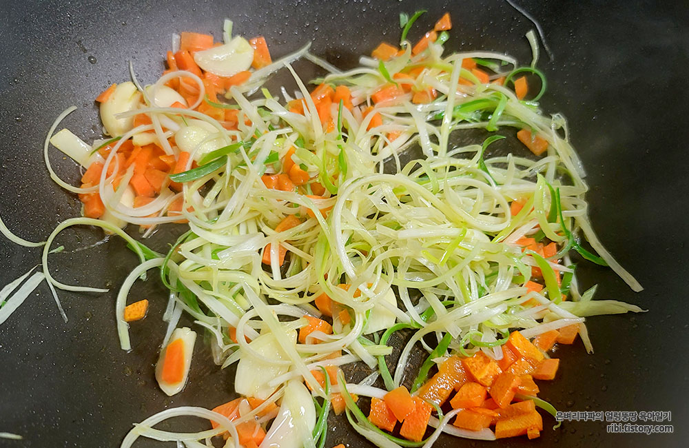 마늘과 당근의 향이 은근히 퍼질 때, 파채를 넣어 다시 볶아줍니다.