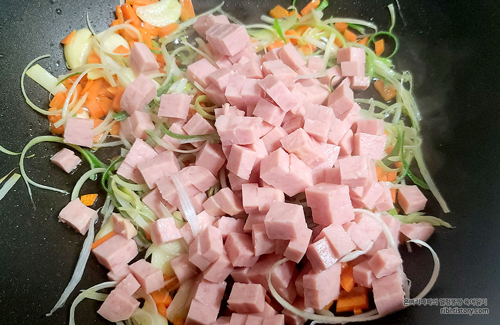 스팸을 넣으니 아이들이 더 좋아하는 것 같아요.