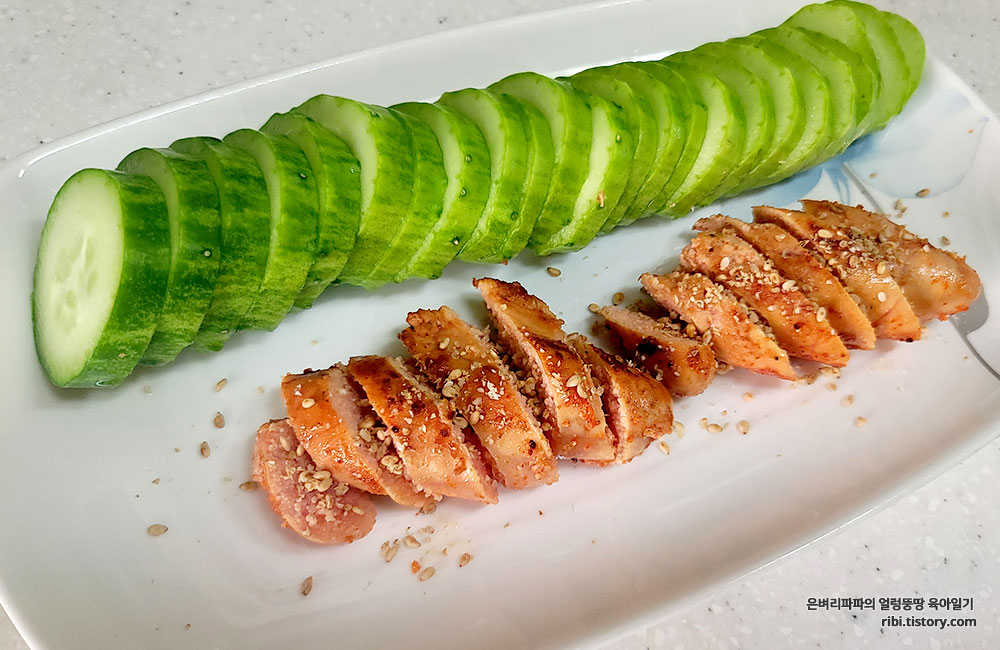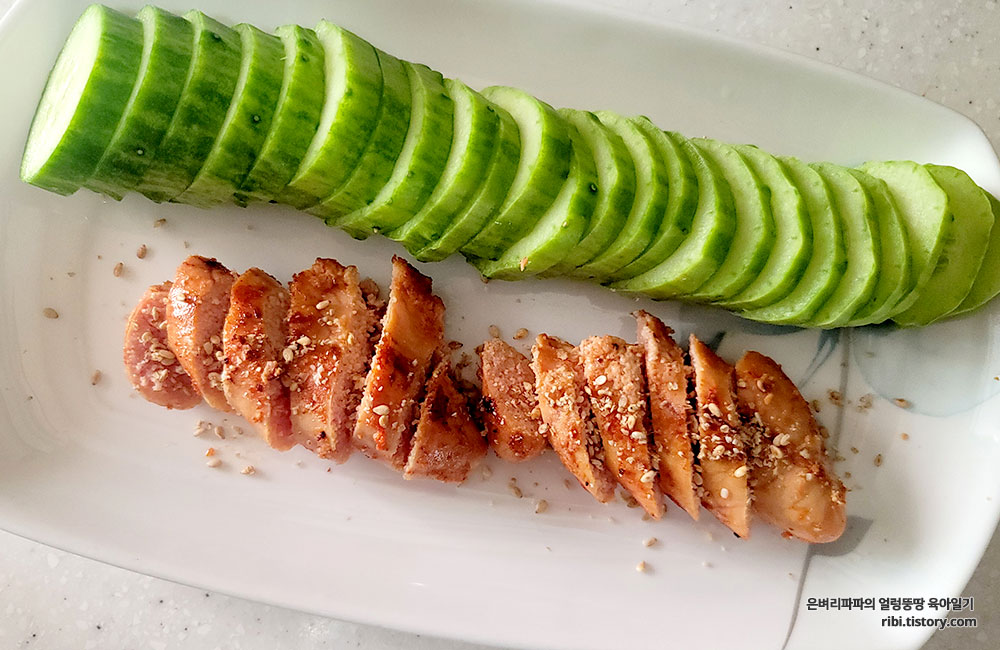 한 김 식힌 후에 썰어 오이와 함께 접시에 담아내면 완성~