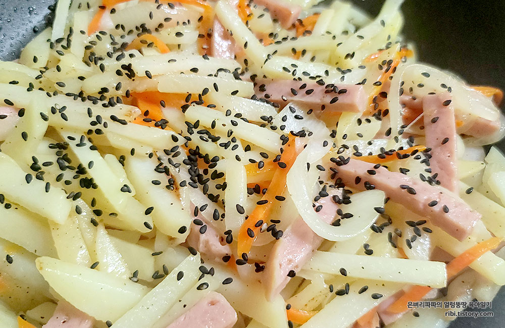 마지막에는 검은깨를 뿌려 햄 감자채 볶음을 완성했어요.