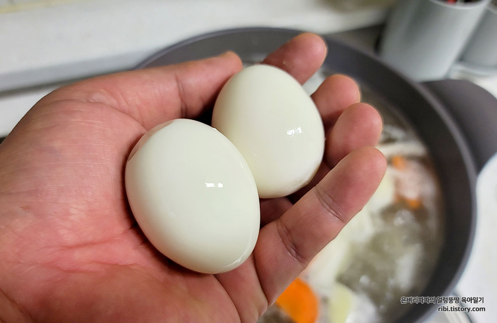 삶은 계란도 껍질을 까서 끓는 육수에 먼저 넣어 줍니다.