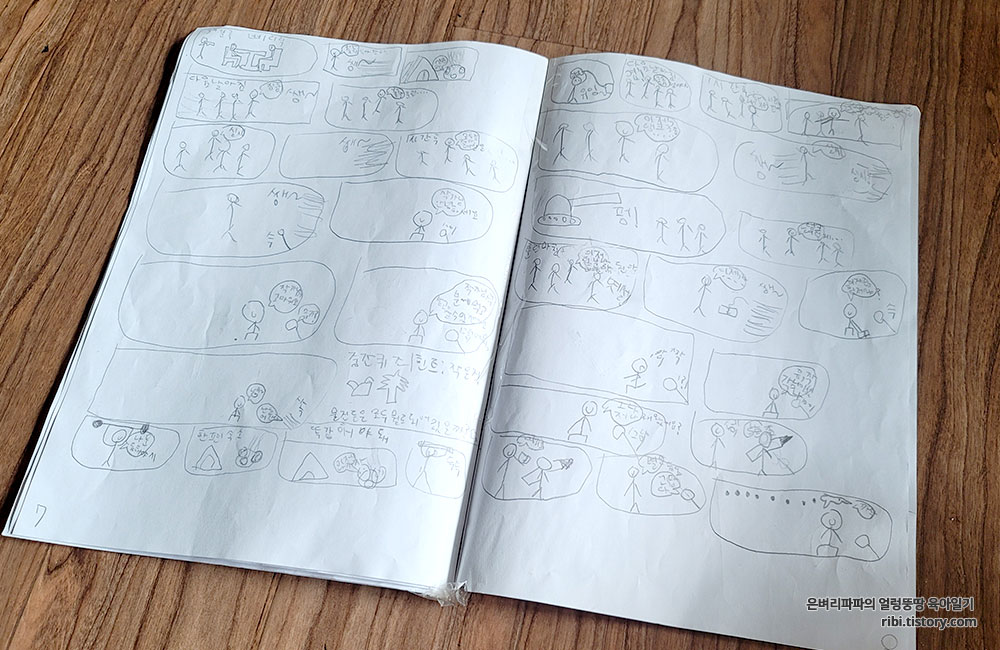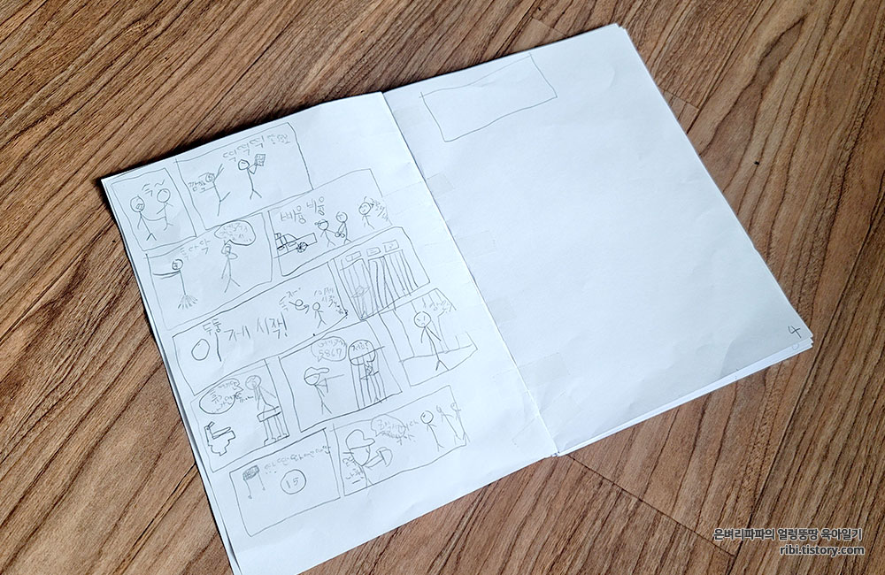 A4용지를 직접 접어 테이프로 엮어 만든 만화책...