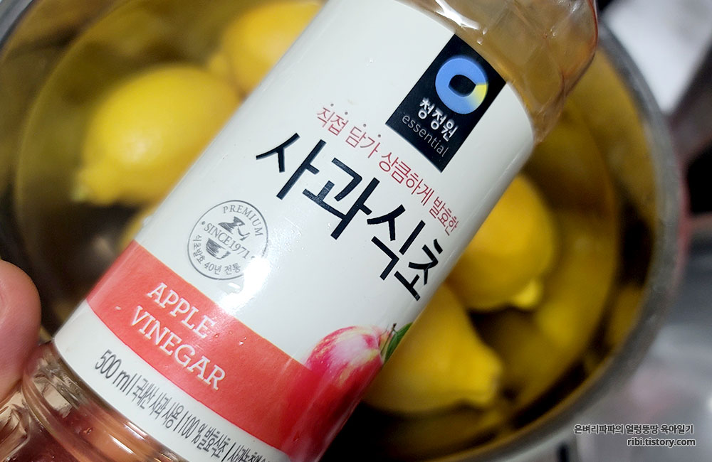 식초물에 레몬을 20여 분간 담가두었습니다.