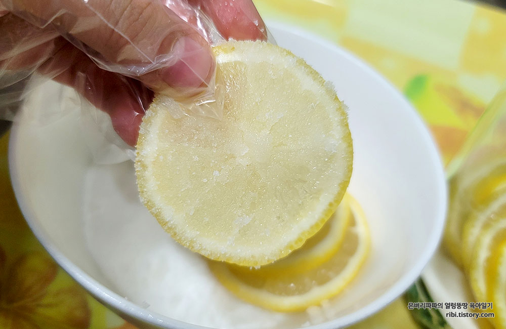 아들 녀석의 도움으로 레몬 하나하나에 설탕을 묻혀 용기에 넣었습니다.