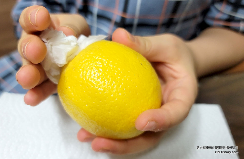레몬 물기 제거 담당은 아들 녀석이었어요.ㅋㅋㅋ