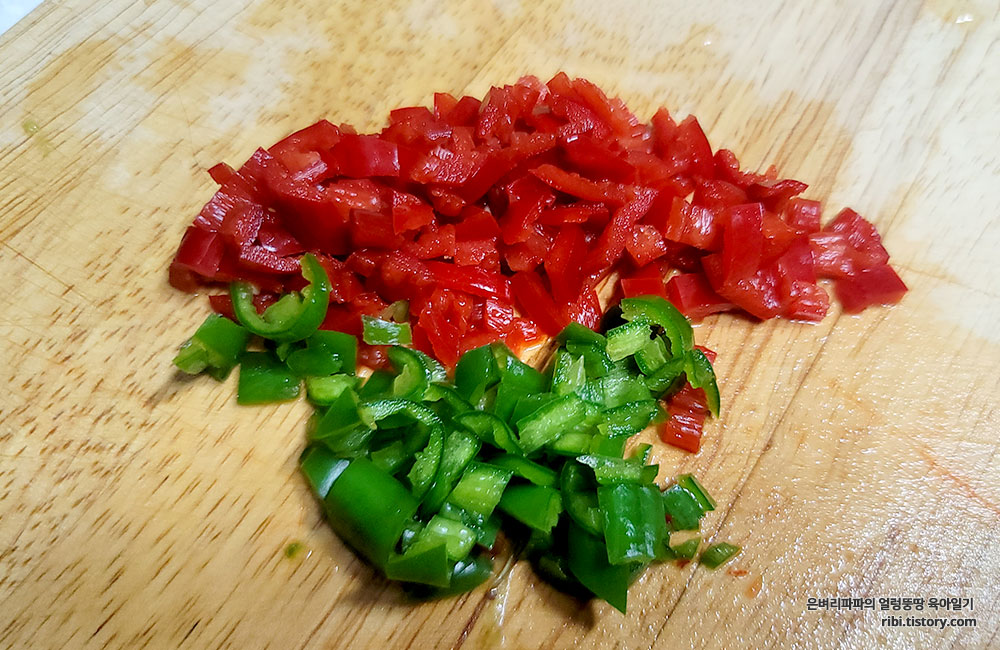홍고추와 풋고추를 곁들이니 보기에도 좋고, 더 맛이 좋은 것 같습니다.