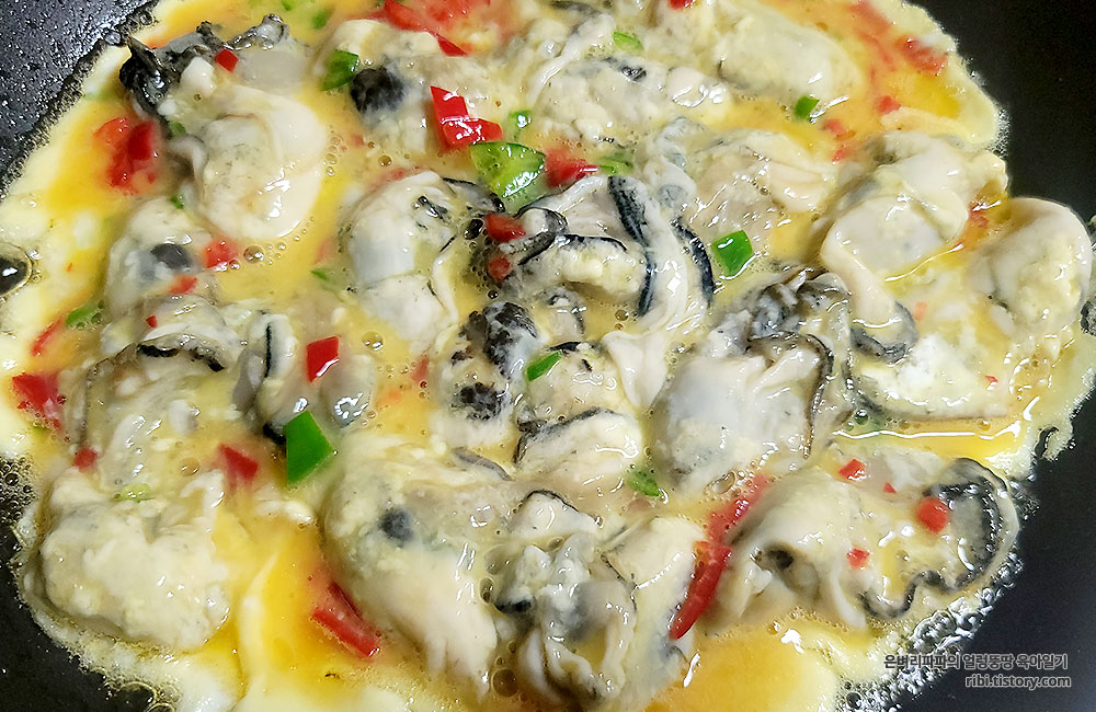 재료 : 굴, 부침가루, 홍고추, 풋고추, 계란, 소금 한 꼬집, 올리브유