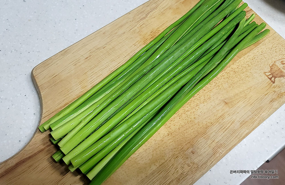 먼저 마늘종을 깨끗하게 씻어 먹기 좋은 크기로 썰어줍니다.