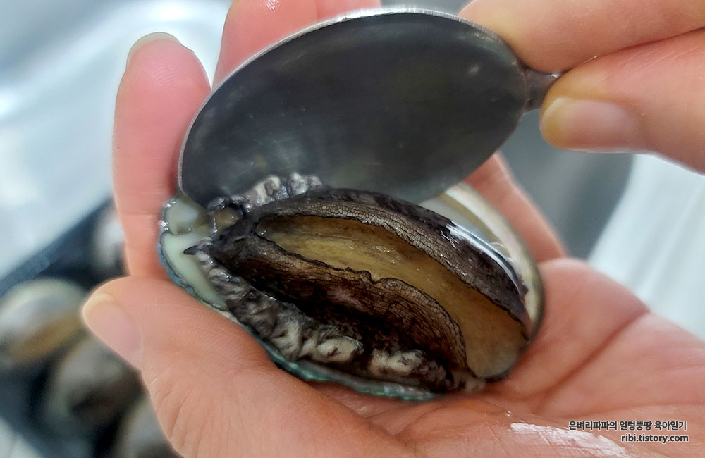 크기가 크지 않아, 한입에 쏙 들어가는 크기의 전복입니다.