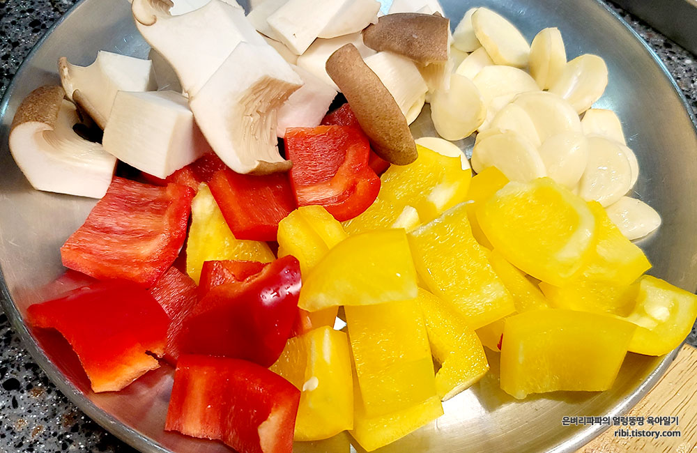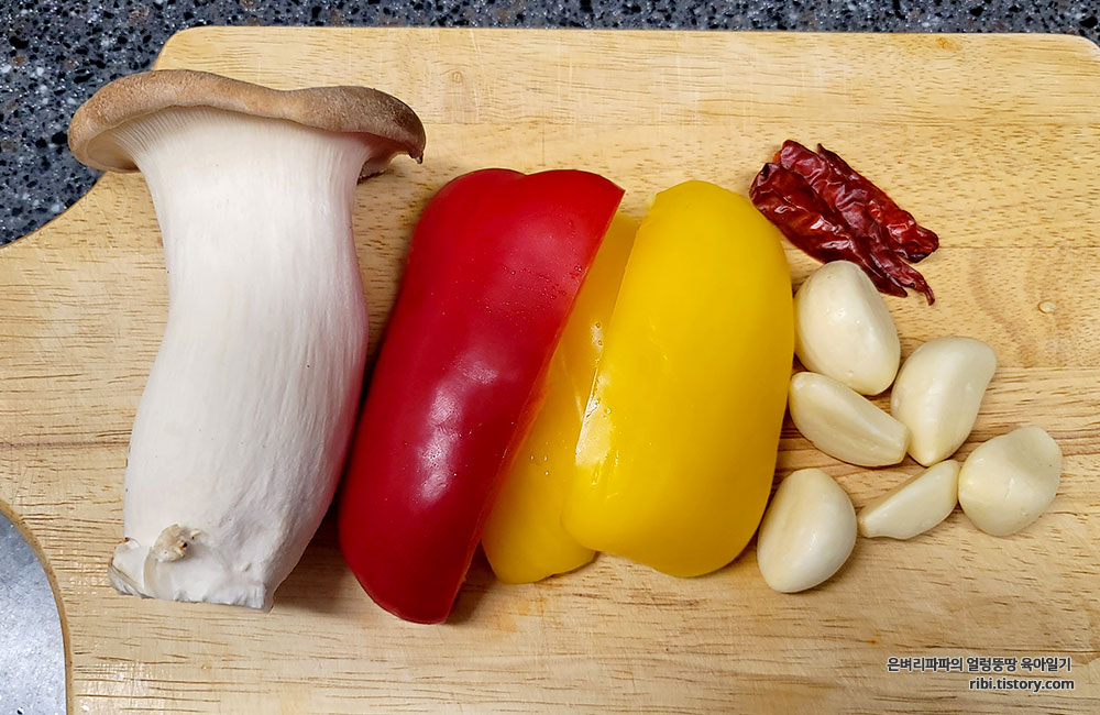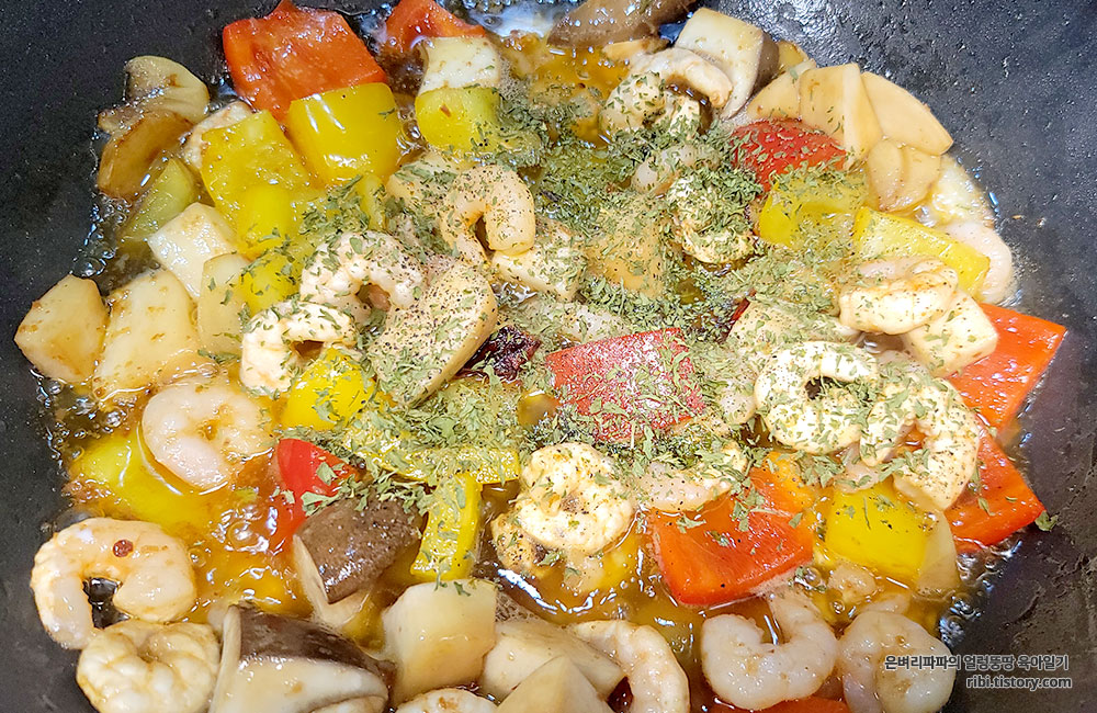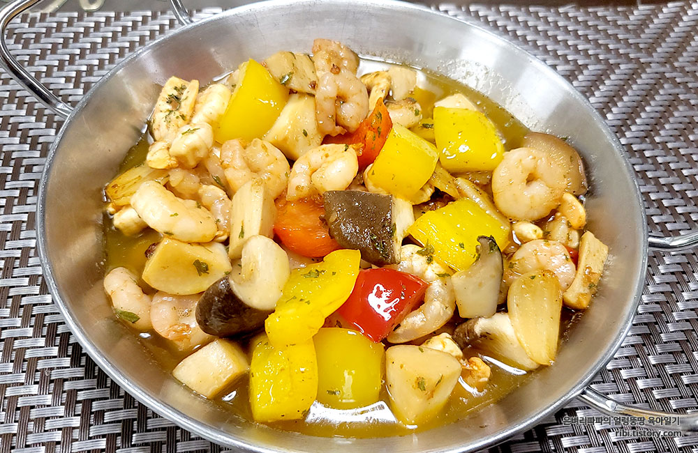 재료 : 새우, 마늘(통마늘 + 간 마늘), 버섯, 파프리카, 페페론치노(베트남 고추),