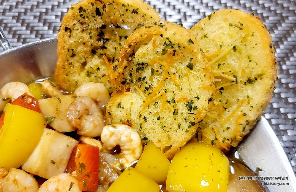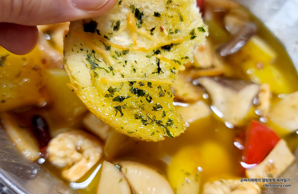 빵이 아니어도, 마늘과 파프리카, 버섯, 새우를 포크를 콕 찍어 한입에 넣어도 맛있습니다.