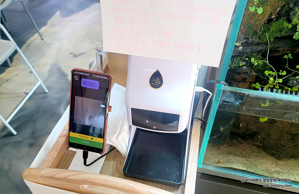 카페 입구에서 개인이 직접 QR체크와 손 소독을 실시합니다.