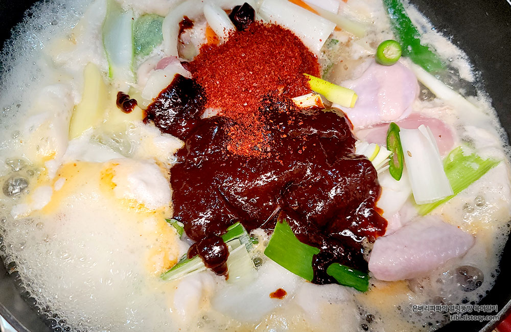 한창 끓기 시작하면 동본 된 다진 마늘을 넣어줍니다.