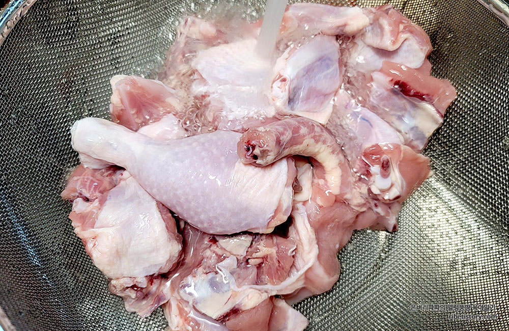 가장 먼저 닭볶음탕의 주 재료인 손질된 생닭을 물에 한번 씻어 주었습니다.