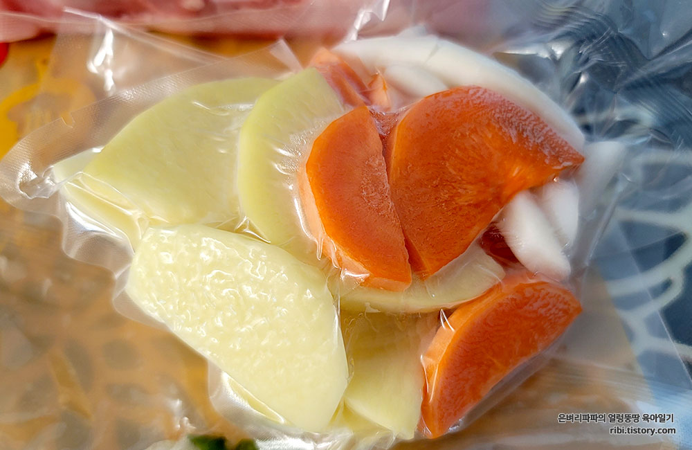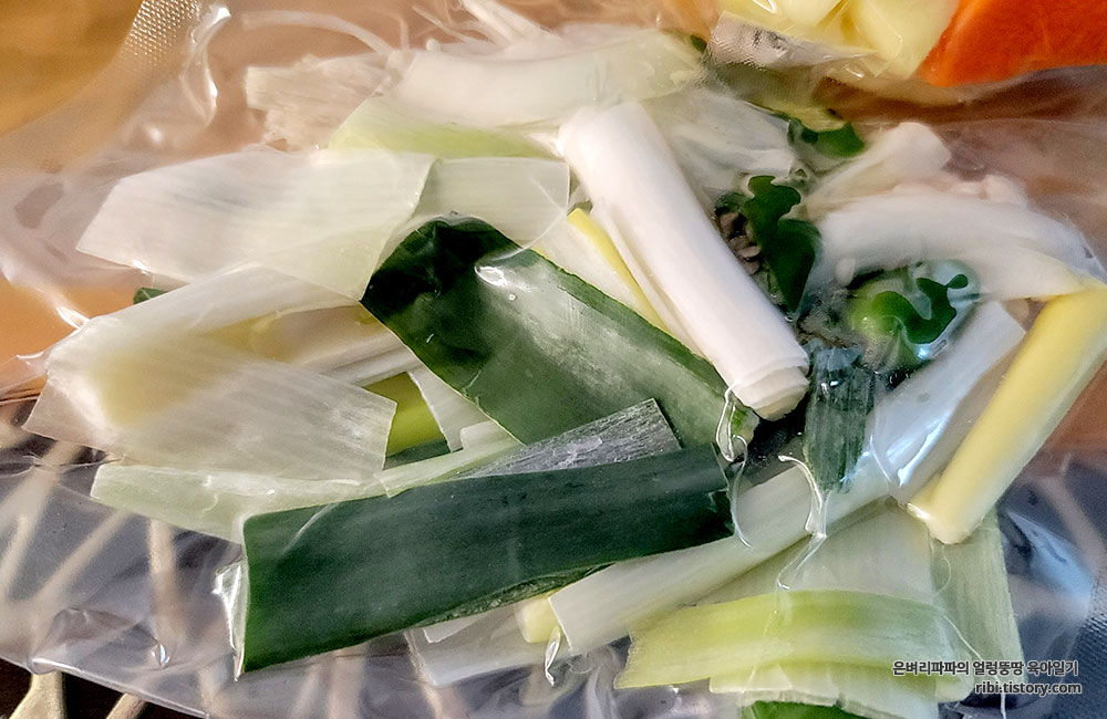 나머지 진공 포장된 채소들을 뜯어 한 곳에 모아 줬어요.