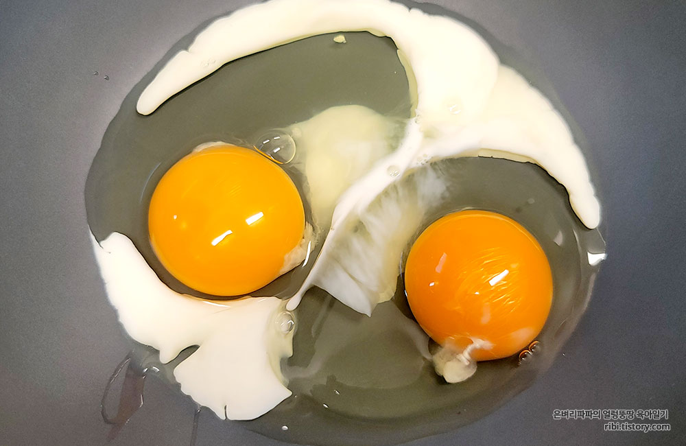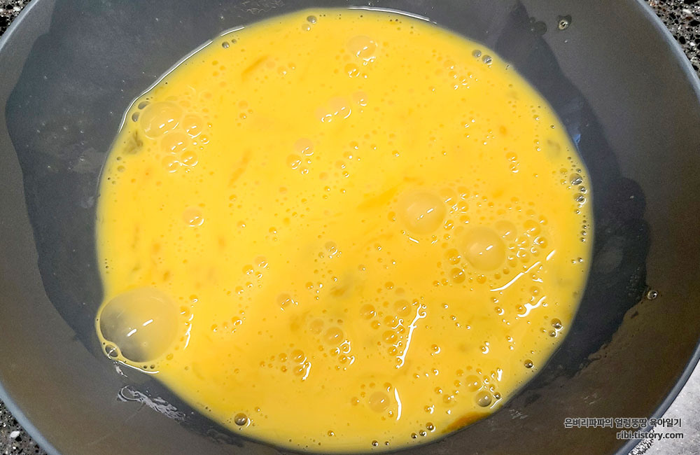 계란을 깨트리고, 우유를 조금 넣어 포크로 휘휘 저어주면 끝~