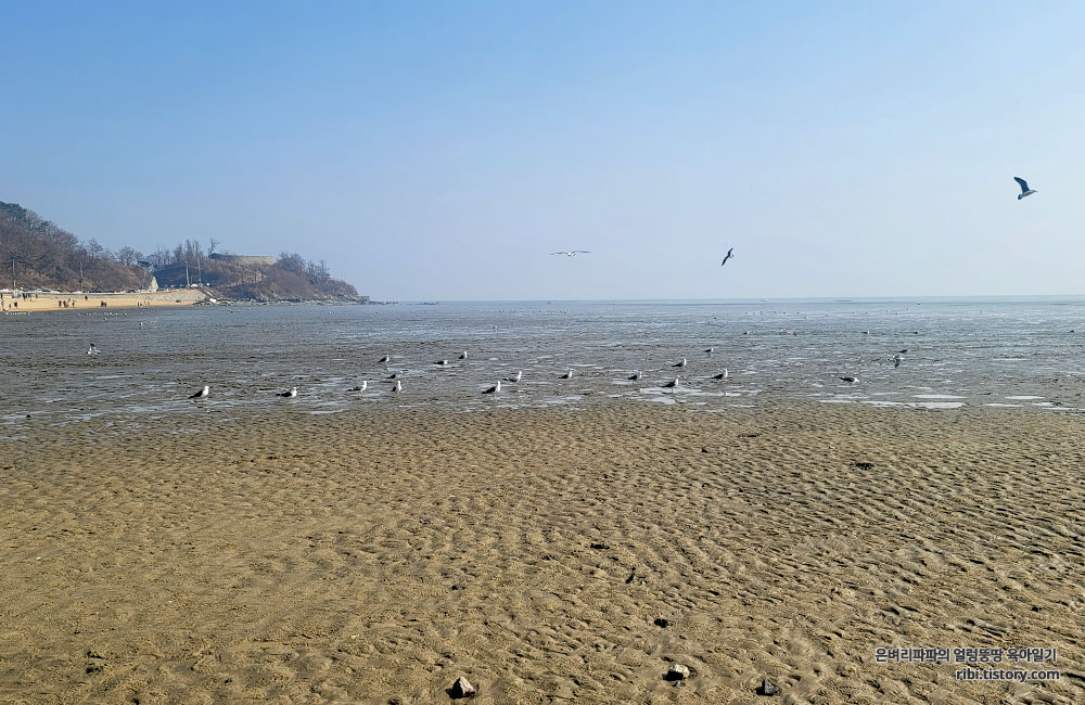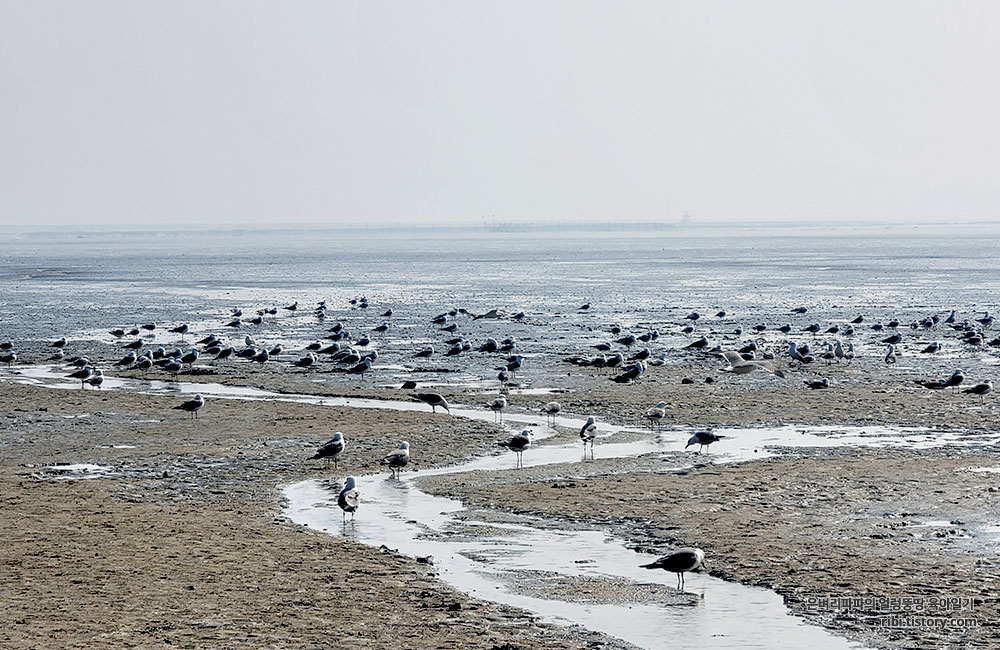 모래사장의 끝~ 갯벌이 시작되는 곳에 갈매기들이 앉아 쉬고 있네요.