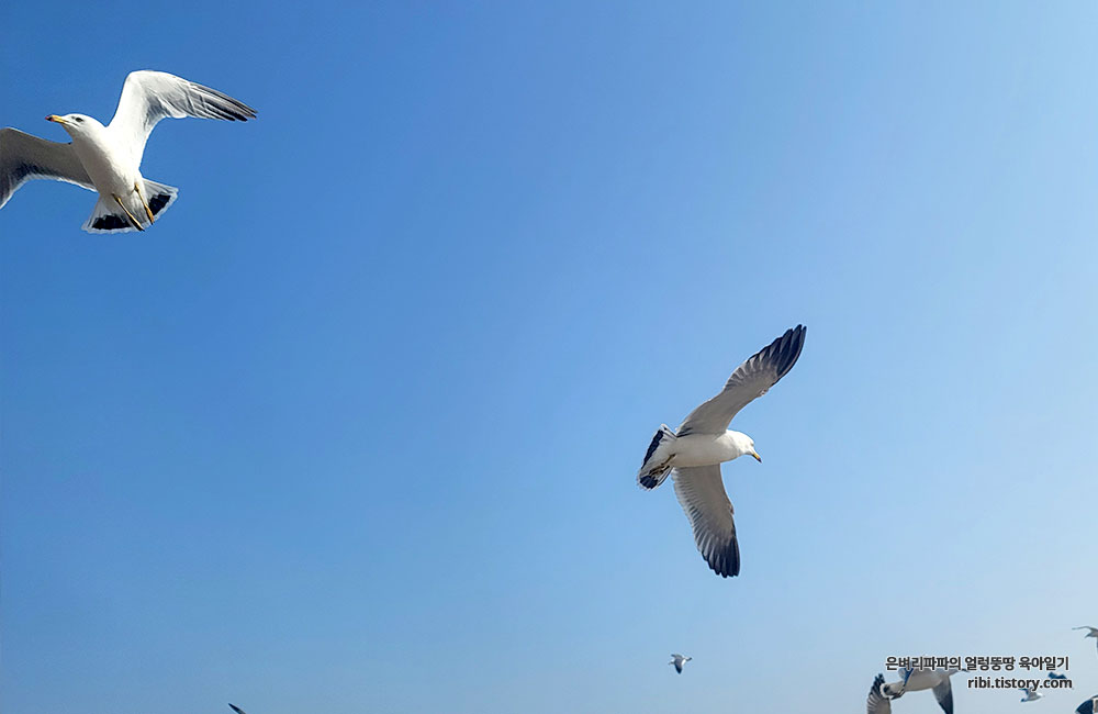 쉼 없이 날갯짓을 하며 머리 위를 빙빙 도는 갈매기들~