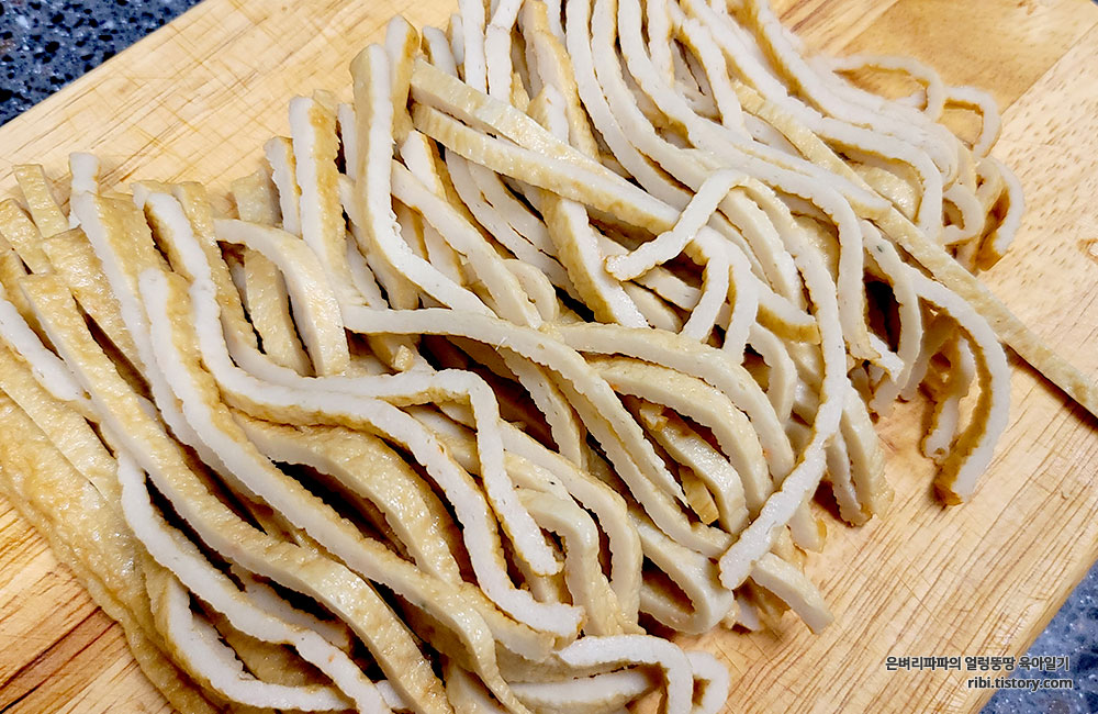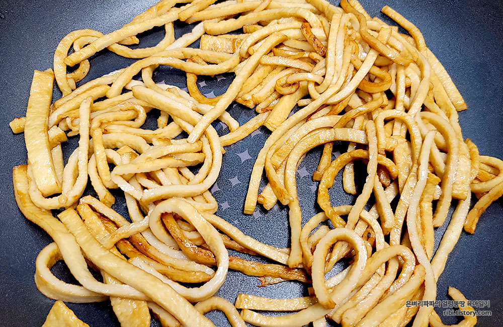 마지막으로 사각 어묵을 가늘게 채썰어 볶아주세요.