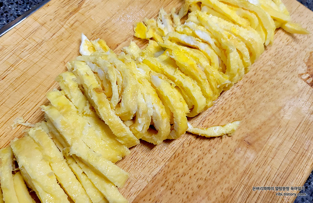 계란 지단을 부쳐 가늘게 채 썰어 준비해주세요.