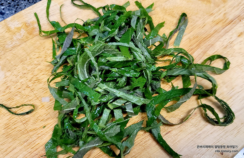 도마 위에 올리고 한꺼번에 돌돌 말아 최대한 가늘게 썰어 준비합니다.