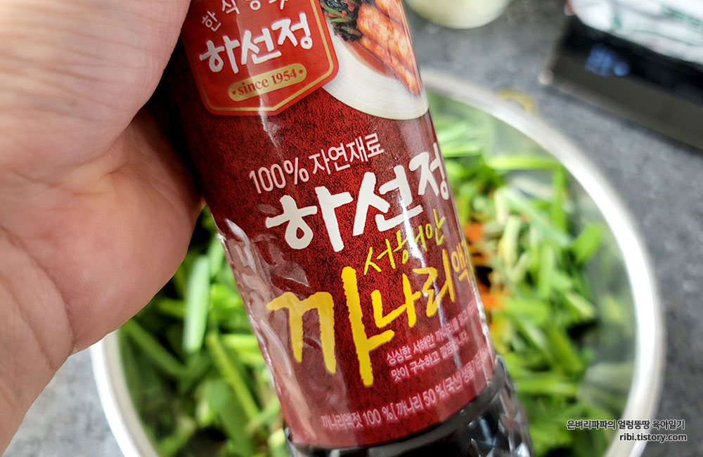 양념을 차례차례 넣어 풋내가 나지 않게 조심조심 버무려 줍니다.