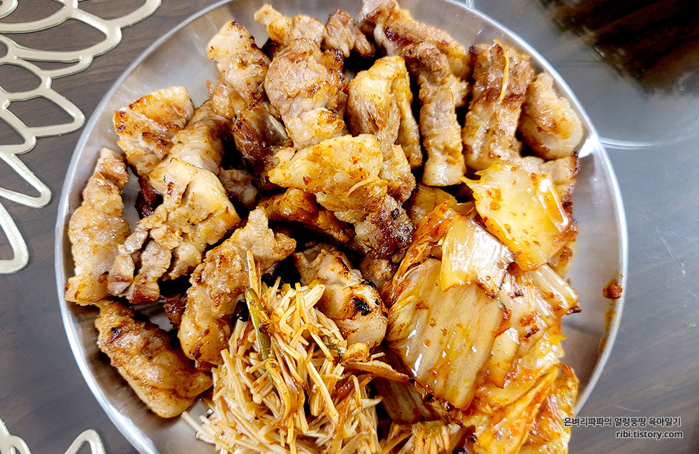 삼겹살과 볶은 김치, 그리고 팽이버섯까지 접시에 담아 식탁에 올리면 완성~