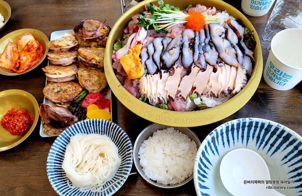 전복을 비롯해 각종 해산물, 해조류, 회가 섞여 있네요.