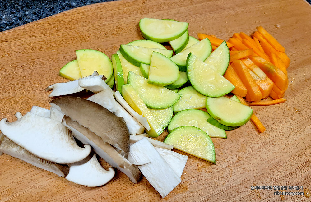 새송이버섯, 애호박, 당근, 그리고 양배추입니다.
