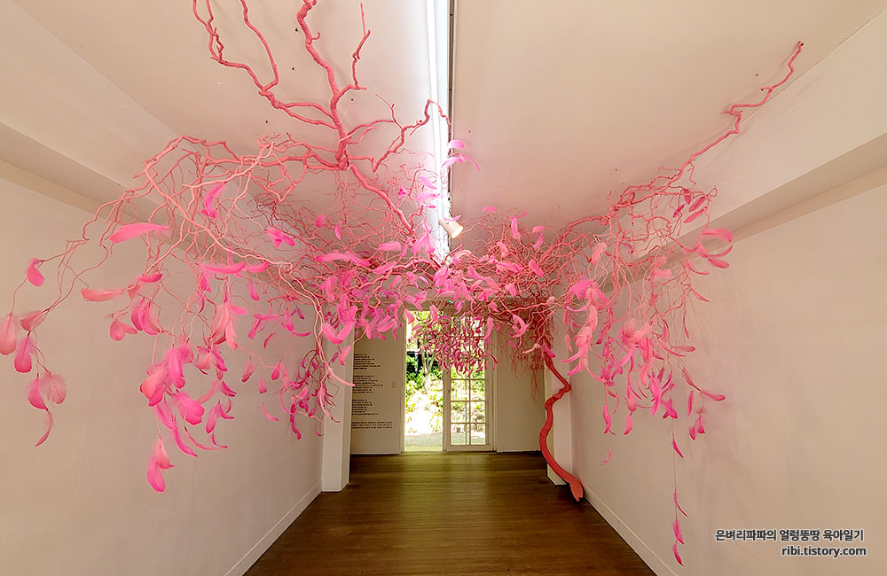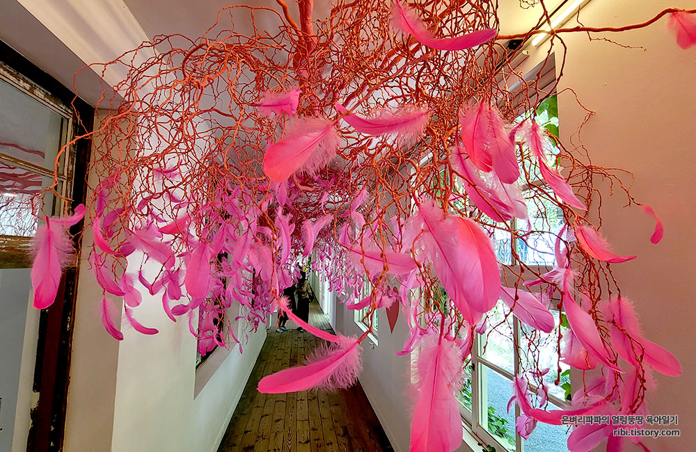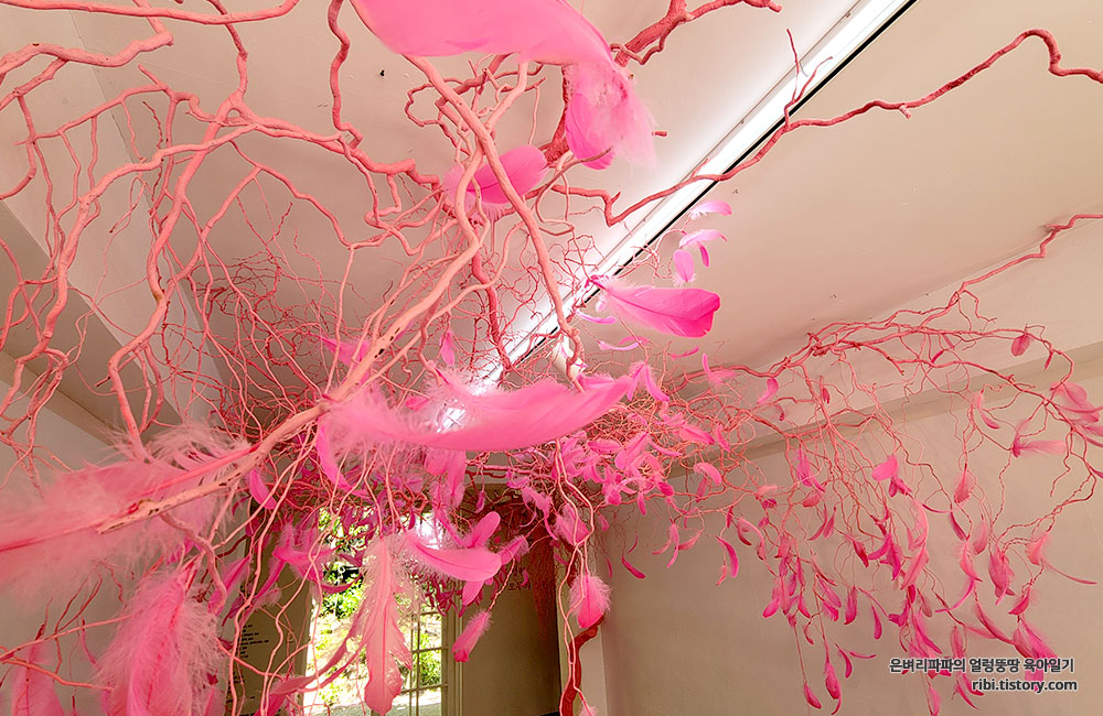 중앙 현관에 설치되어 있던 핑크 핑크 한 나뭇가지와 깃털~