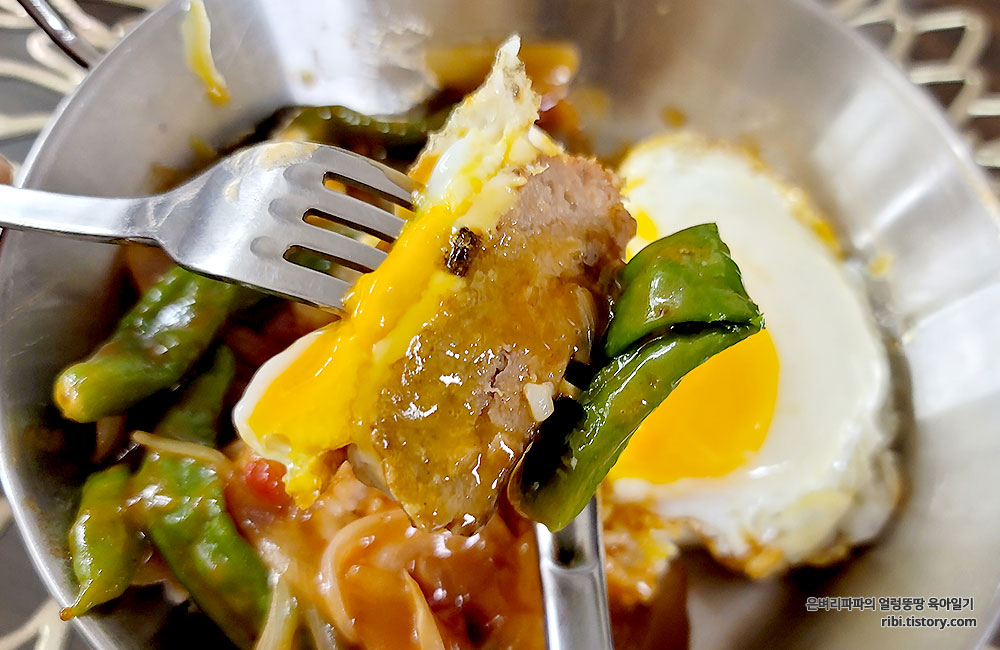 함박스테이크와 부드러운 계란, 그리고 꽈리고추의 식감이 아주 재미있습니다.