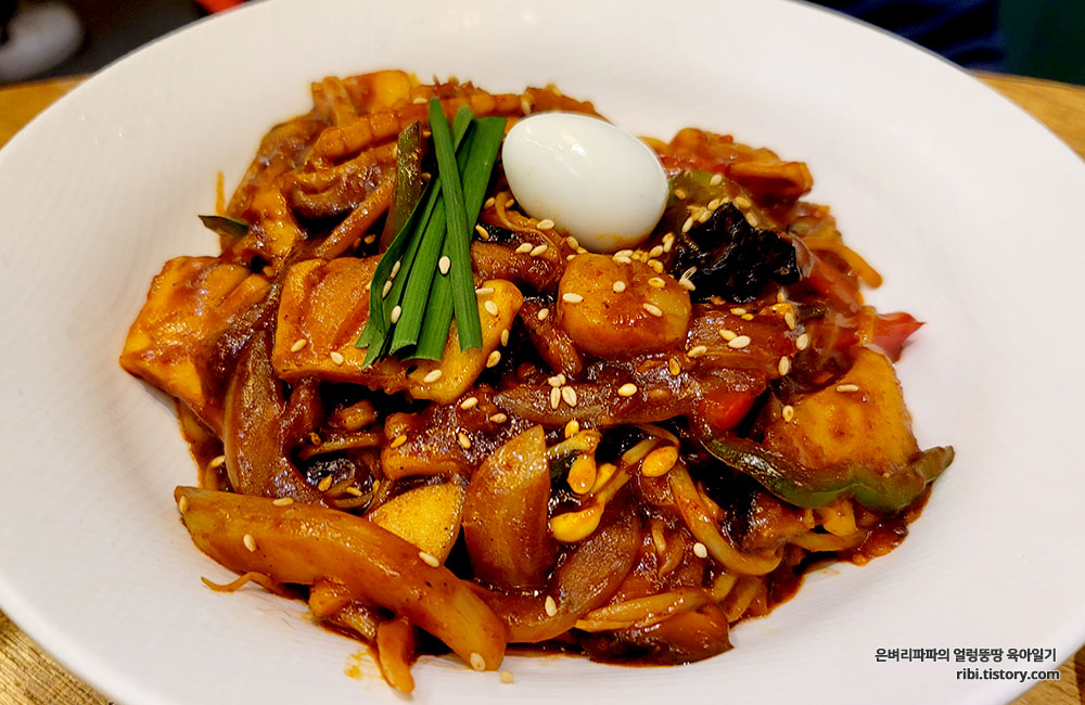 각종 해산물과 통나물, 채소를 매콤한 소스로 볶아낸 듯했어요.