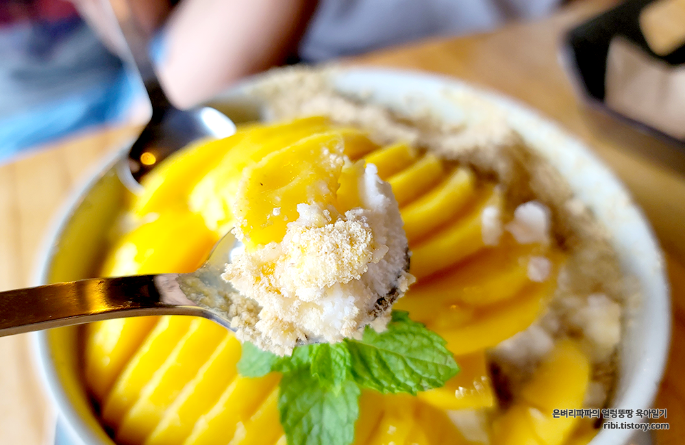 입안 가득 퍼지는 망고의 향과 식감, 눈꽃빙수의 부드러움이 참 잘 어울립니다.