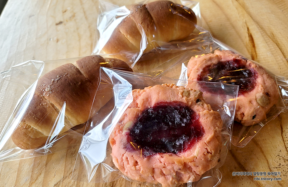 딸아이가 주문한 소금 빵과, 아들 녀석이 주문한 체리 쨈이 가득 올라간 쿠키입니다.