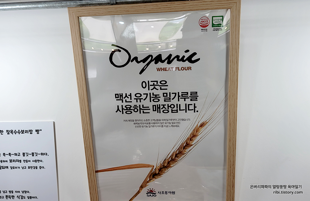 그리고 카페 내부의 베이커리 진열대 위에 붙어 있는 유기농 밀가루 사용 인증 안내판...