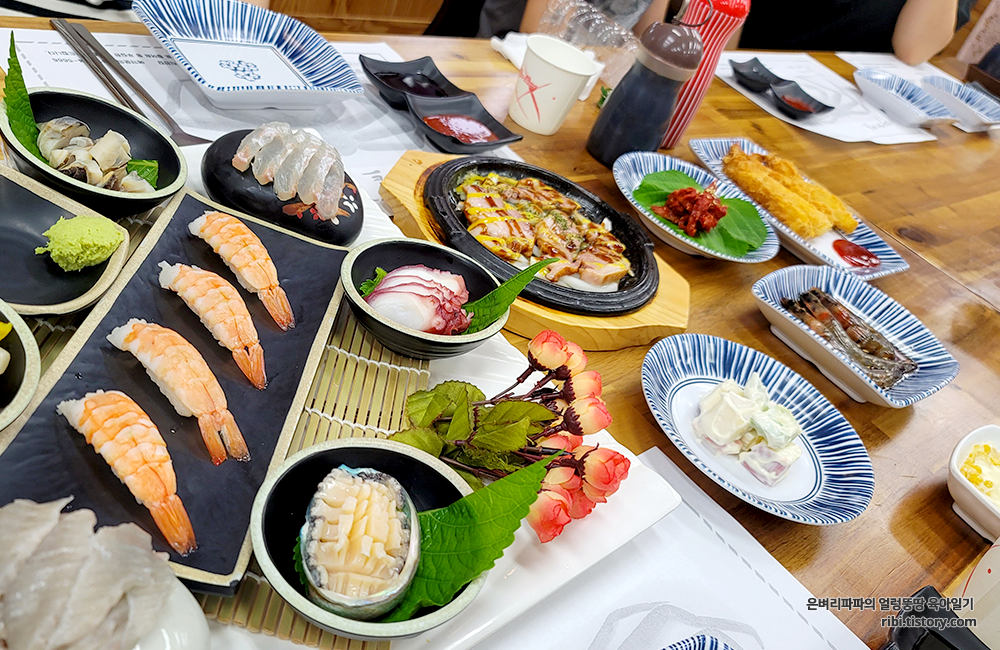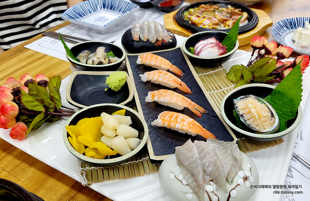 초밥과 전복이 포함된 회가 푸짐합니다.