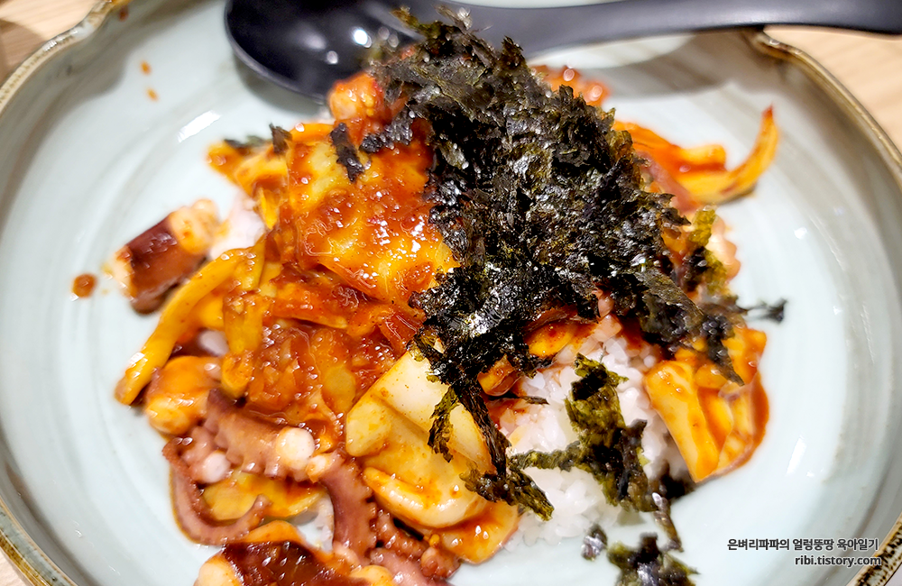 따뜻한 밥 위에 낙지볶음을 듬뿍 올리고, 김가루를 뿌려 슥슥 비벼봅니다.