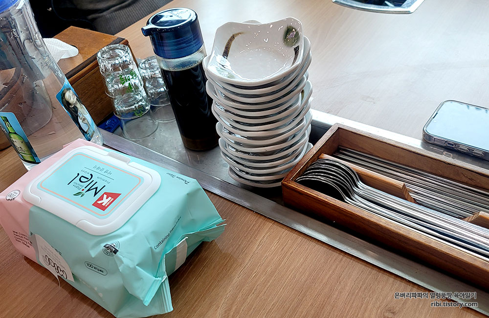 각 테이블에는 기존적으로 수저통과 조그만 앞접시, 소스 통과 소주잔이 놓여 있습니다.