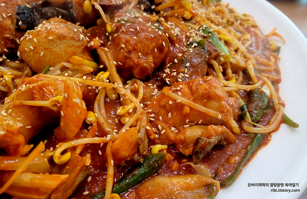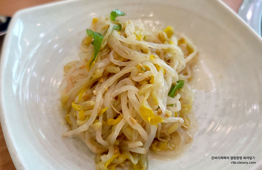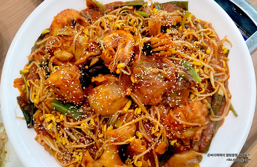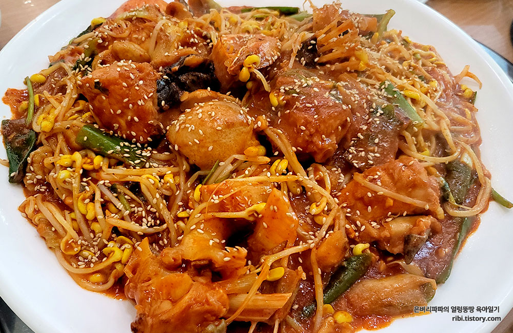 양념을 잔뜩 머금은 아삭한 콩나물과 간간히 씹히는 미더덕...