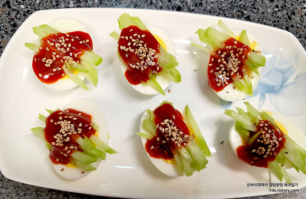 삶은 달걀 반 개에 채썰거나 얇게 저민 오이와 초고추장을 올려내는 간식이다.
