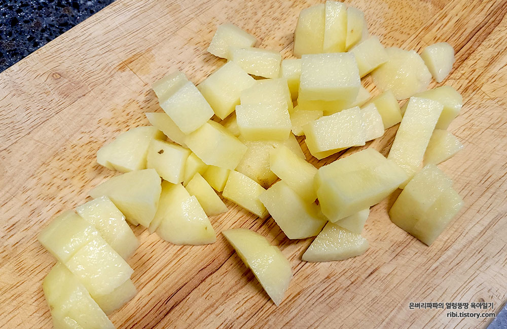 시간이 촉박하기에, 손톱만 한 크기로 감자를 썰어 줬어요.
