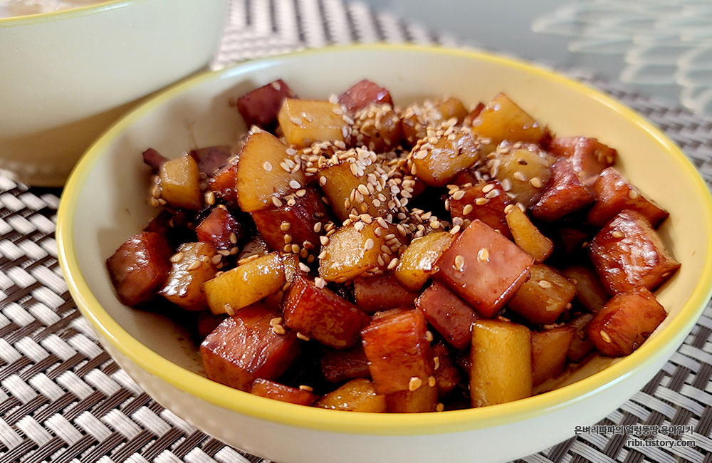 재료 : 감자, 깡통햄, 올리브유, 조림간장, 올리고당, 참기름, 참깨