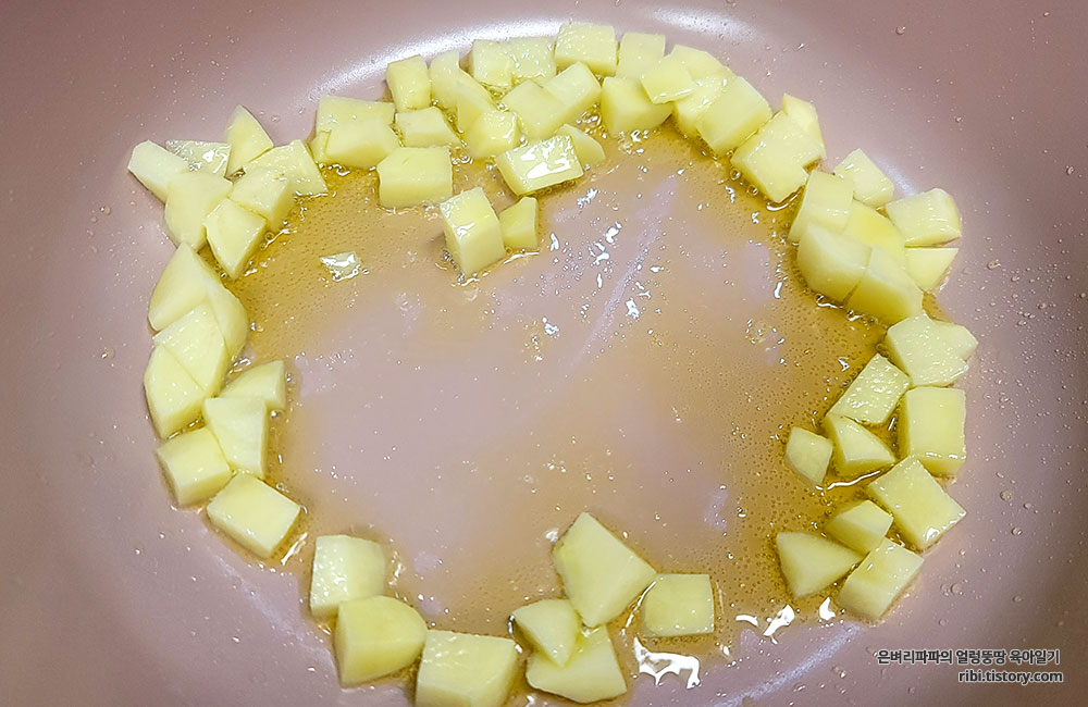 볶음팬에 올리브유를 두르고, 감자를 먼저 넣고 볶아줍니다.