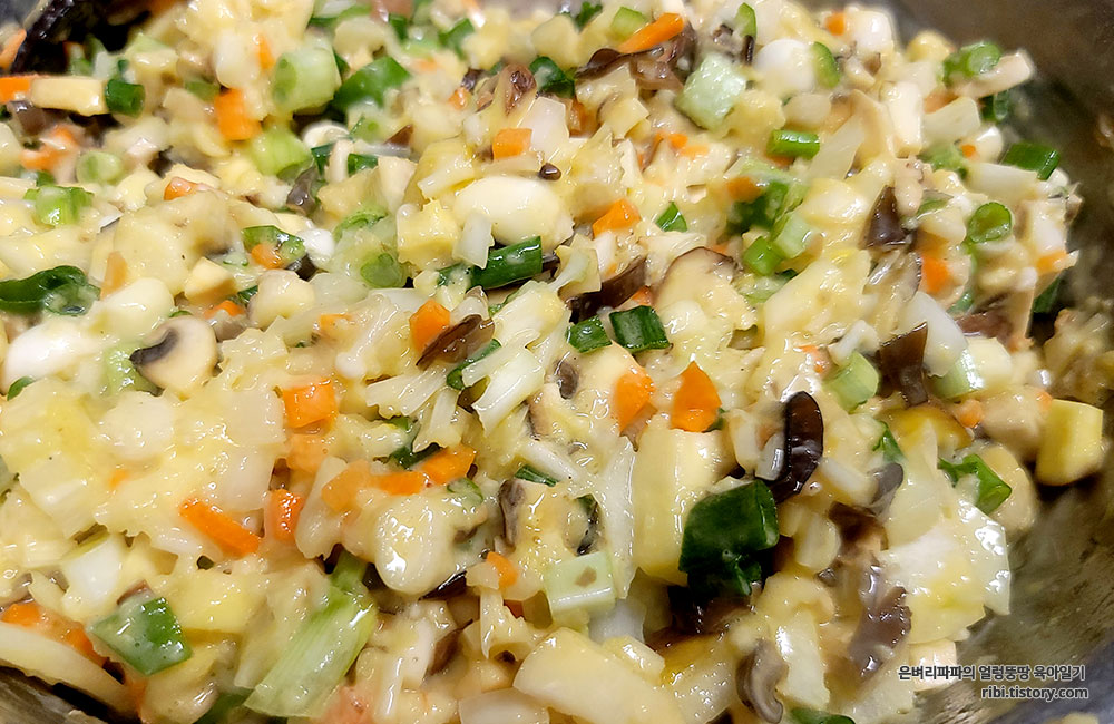 반죽이 조금 뻑뻑하면 잘게 썬 재료들이 탈출하는 사태가 발생합니다.ㅋ