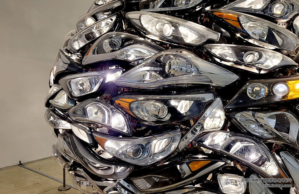 폐차직전 자동차에서 분해한 전조등과 후미등을 모아 원형의 별로 조립한 작품입니다.