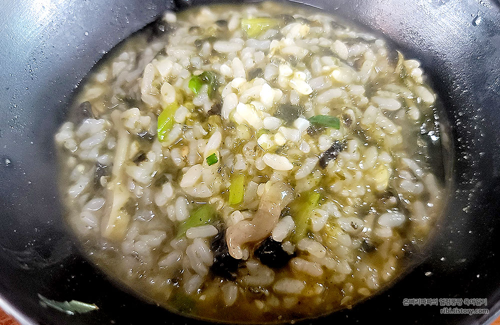 아내의 그릇에 담겨있던 칼국수 국물을 다시 냄비에 부어 시크하게 죽을 만들어 주셨습니다.